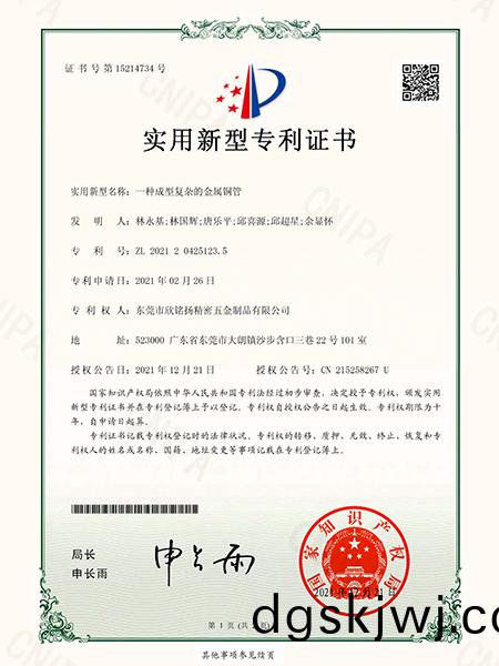 一種(zhong)精密(mi)銅(tong)筦(guan)銅套組(zu)件(jian)實(shi)用(yong)新型(xing)專(zhuan)利(li)證(zheng)書