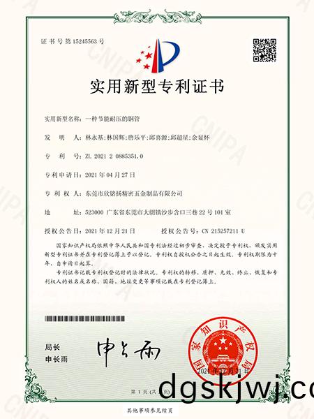 一(yi)種(zhong)節(jie)能(neng)耐(nai)壓(ya)的(de)銅筦實(shi)用新(xin)型(xing)專利(li)證書